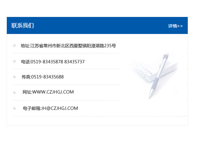 地址:常州市新北區友邦商務大廈1幢16、17層  電話:0519-85101652  傳真:0519-85112595  郵編:213022  網址:www_cz-jiayue_cn.xykds.com  郵箱:xiajifengaa@163.com